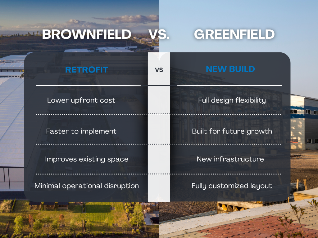 The key question when deciding brownfield vs greenfield remains the same: does the facility support your operation today and allow room for tomorrow's growth?