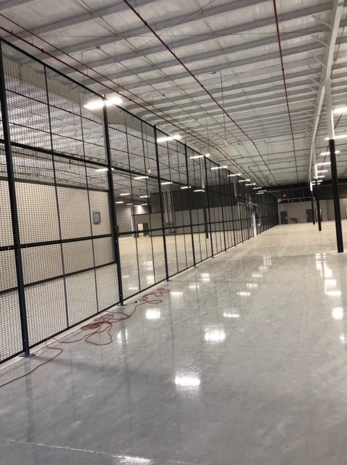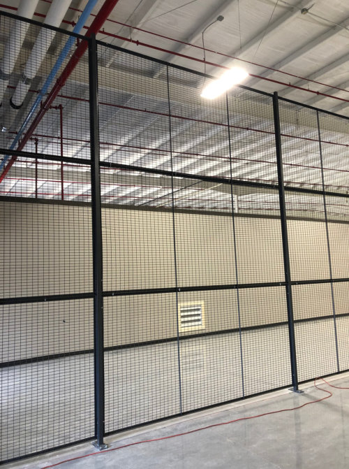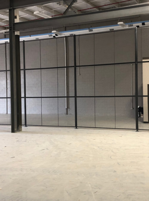 For this project, we used WireCrafters’ style 840 partitions. These partitions were served as mesh fencing and stood 15’ 5 ¼” in height. These gray finished partitions didn’t have ceilings and used double-hinged doors standing 7’ tall, which employed custom magnetic locks for key card access.